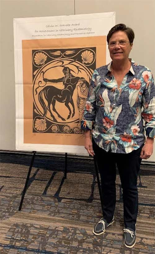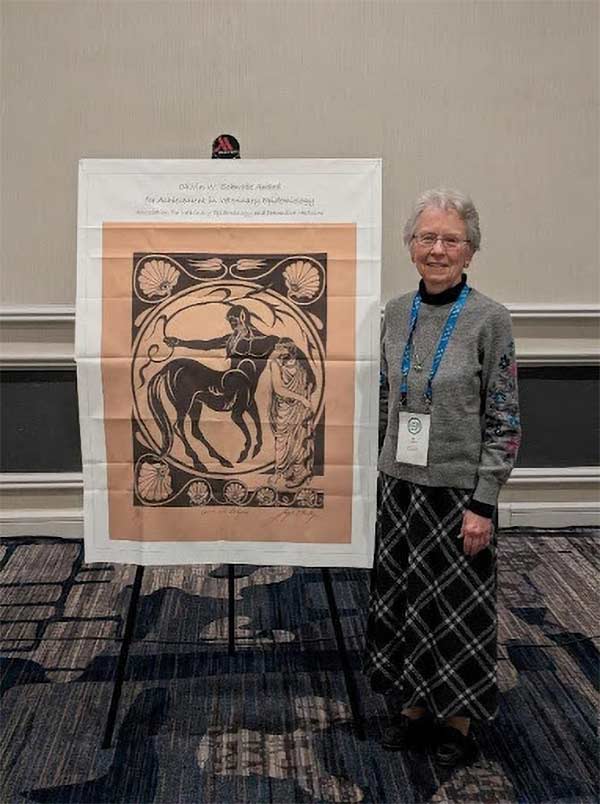 The 2025 Calvin W. Schwabe award was awarded to Jan Scarlett, Professor Emerita of Epidemiology, founder, and former Director of the Maddie’s Shelter Medicine Program at Cornell University. In the mid 1990’s a consultation with animal welfare groups changed the direction of her career. That experience awakened her passion for companion animal welfare and married it to her epidemiologic and preventive medicine skills. With Dr. Lilia Miller (ASPCA), she offered the first didactic course in the country addressing the welfare and population health management of shelter animals. With funding from the National Council on Pet Population and Policy she helped design and conduct some of the first studies of factors leading to relinquishment of animals to shelters. That consultation led to a series of seminal epidemiologic studies that stimulated interest and opened the door to a growing literature regarding the welfare/medical care of shelter and other homeless animals (that continues to this day).